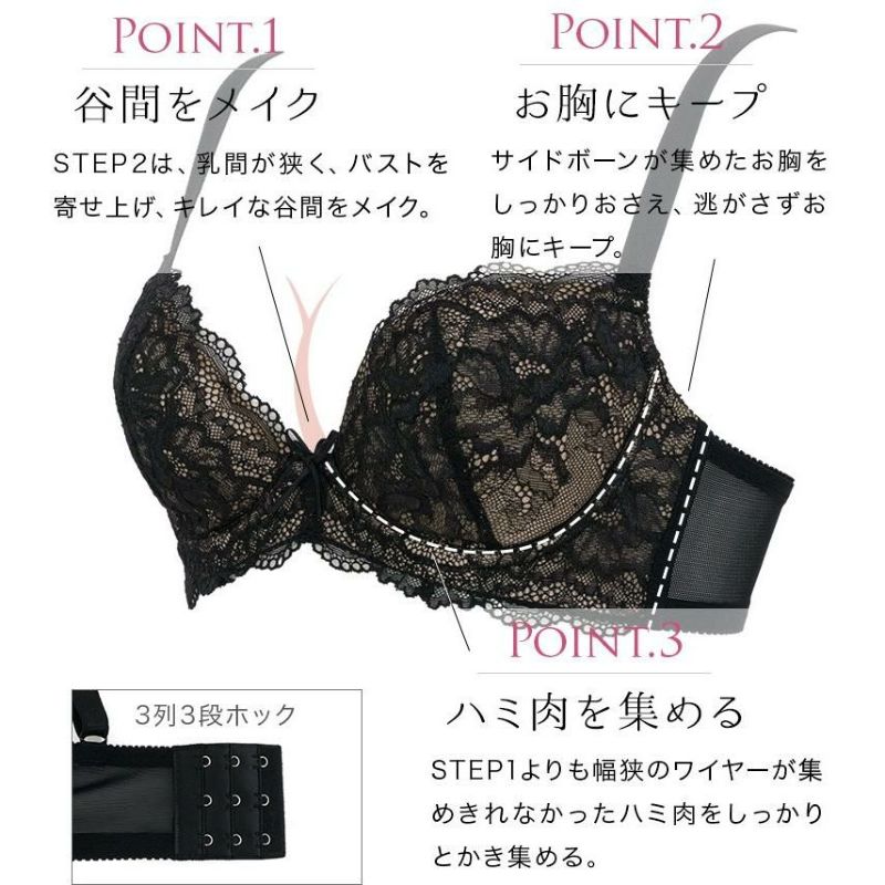 ステップ2の特徴は、ステップ1よりも底面積の狭いワイヤーで、カップに深みを持たせているため、バストの高さをつくります。さらに、乳間が狭く、集めたバストを中心に寄せる機能を持っています。