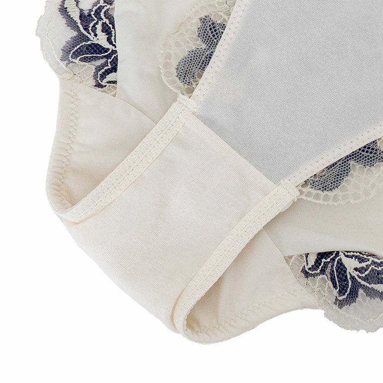 フロントの裏打ちは透け防止の為、ブラと同色のトリコット*を使用しています。滑らかなトリコット*は肌触りが良く、はき心地の良い着用感です。