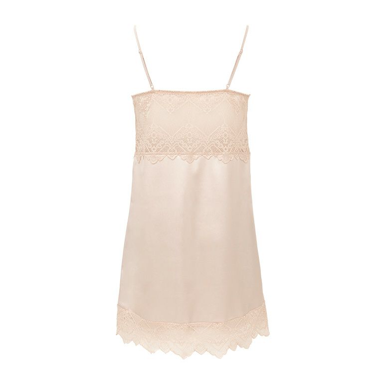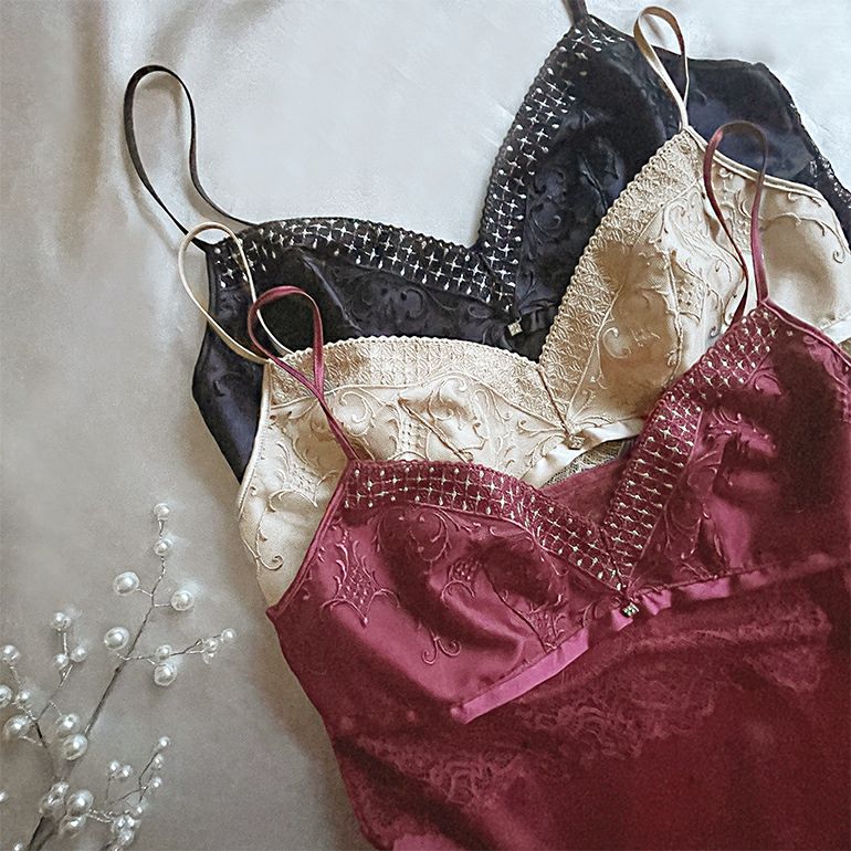 バスト下やバック上辺、裾回りにはストレッチラッセルレース*を贅沢に使用。程よい透け感で素肌を美しく見せます。