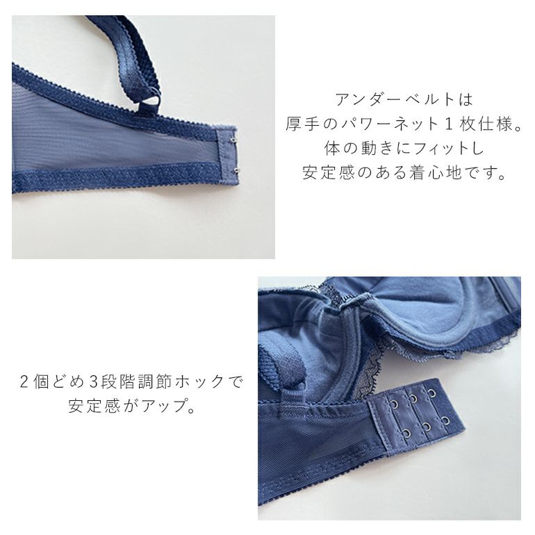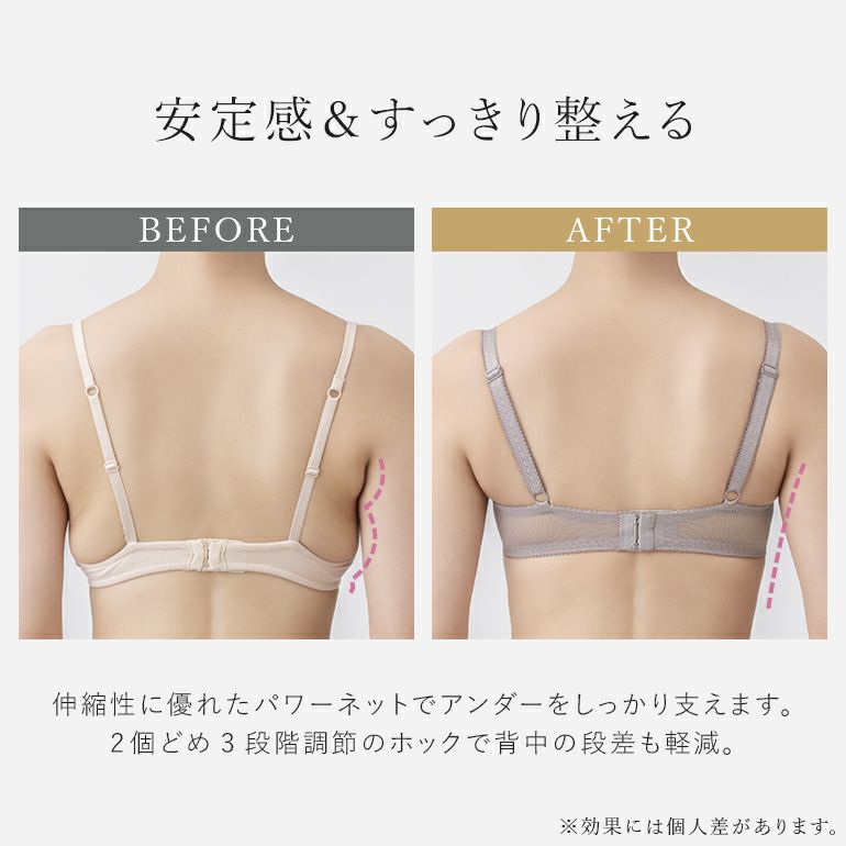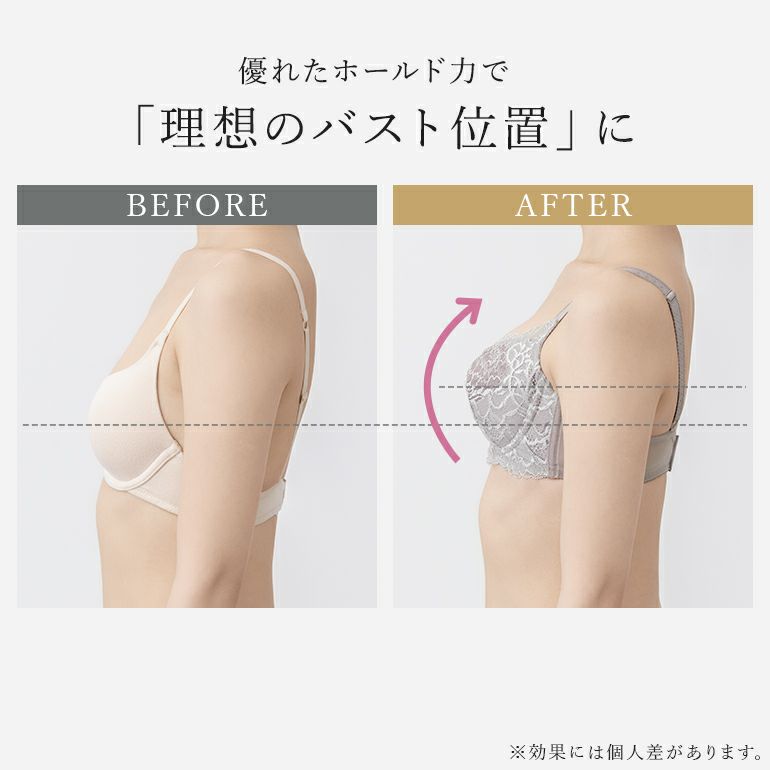 前浅ワイヤーが脇をすっきり整えて丸みのある女性らしいバストを作り、バストトップを高い位置にキープします。
