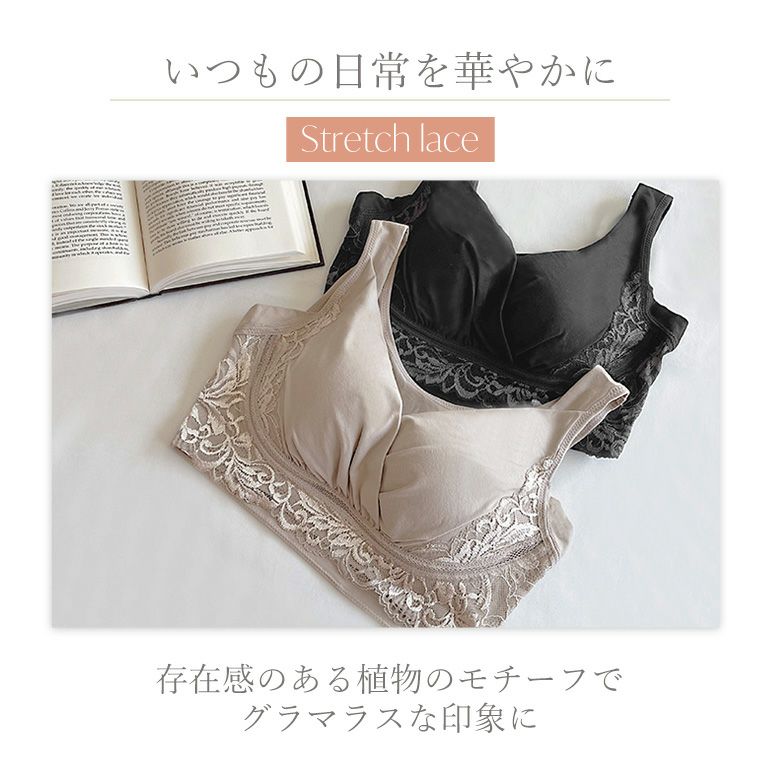 刺繍のような存在感のある二浴染め*光沢落下板ストレッチレースをふんだんに使用した、補整ノンワイヤーブラです。