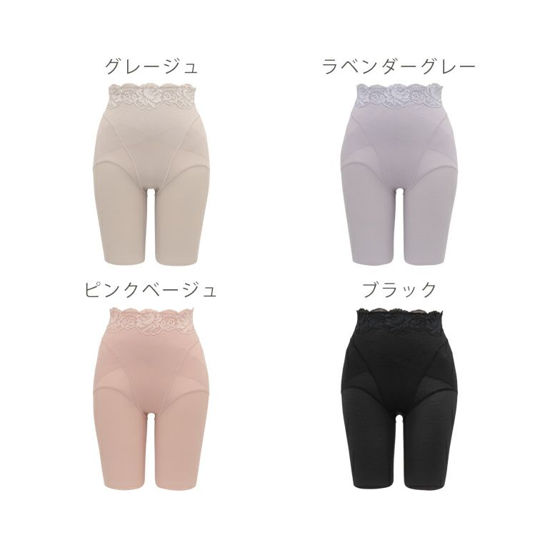 綿混トリコットサテン*素材と、ナイロン綿ベア天竺*を組み合わせたハイブリッド仕様の補整ガードルです。前ウエストからサイドにかけクラシカルなローズ柄のストレッチレースを使用し、スカラの流れがエレガントで高級感のあるデザインです。