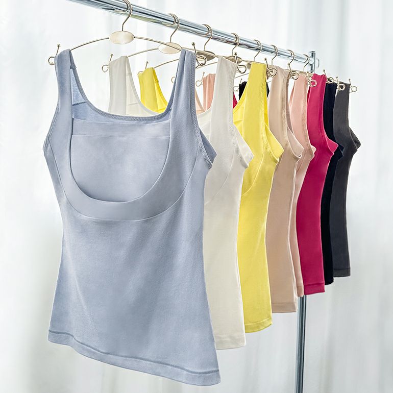 胸元は谷間見えを防ぐスクエア型で、アウターから見せる着こなしも楽しめます。