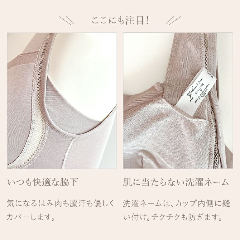 柔らかくなめらかな肌触りの「シルクレーヨン混ベア天竺*」を使用した、ゆきねえシリーズの補整ノンワイヤーブラキャミです。