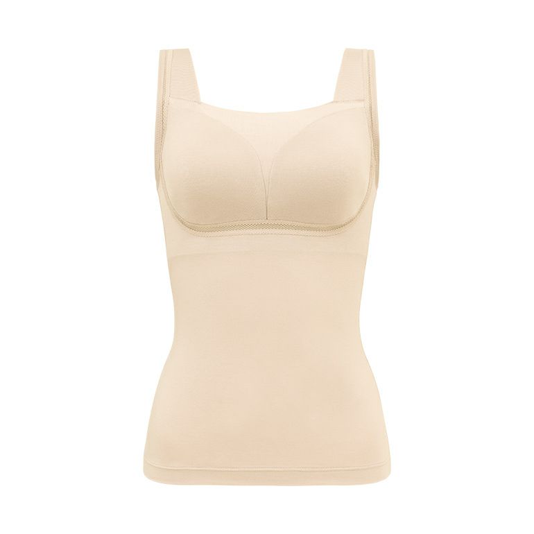 お腹とバックは、身生地一枚仕様でなめらかな着心地です。幅広のタンクトップ型ショルダーは肩への負担を軽減し、良く伸びて幅広い体型にフィットします。