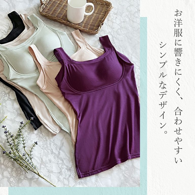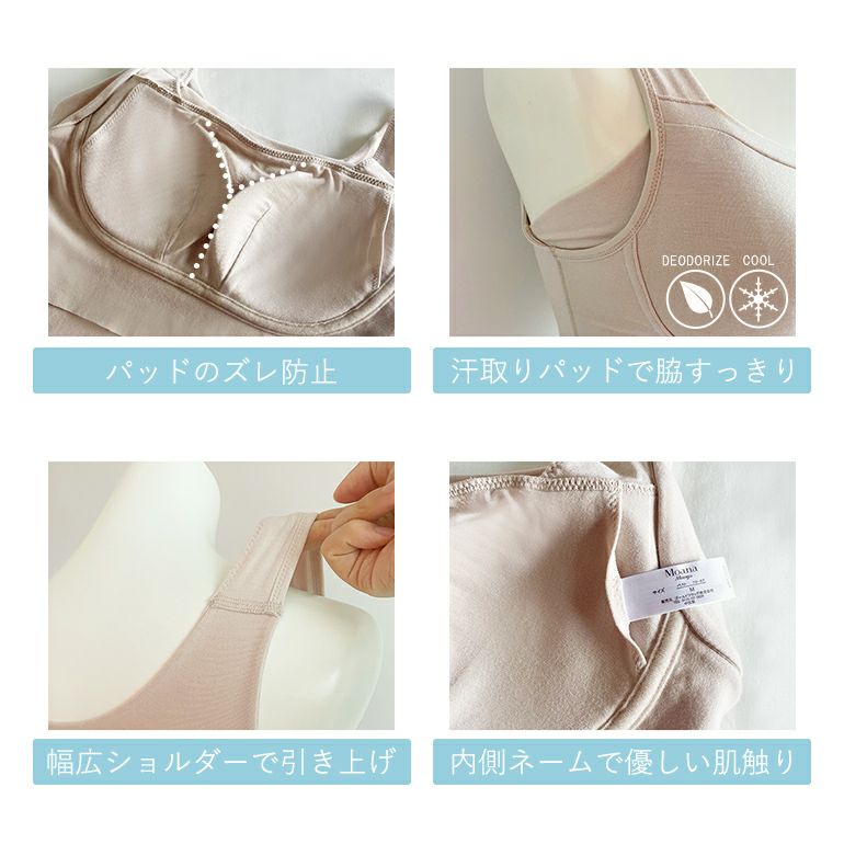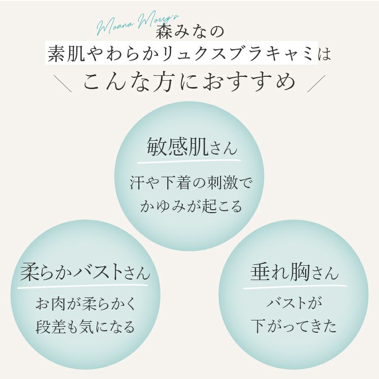 天然由来で、やわらかくなめらかな肌触りが特徴の「テンセル™モダール繊維*」を使用した、素肌にやさしい着心地の補整ノンワイヤーブラキャミです。レース不使用でアウターにも合わせやすく、デイリー使いしやすいデザインです。