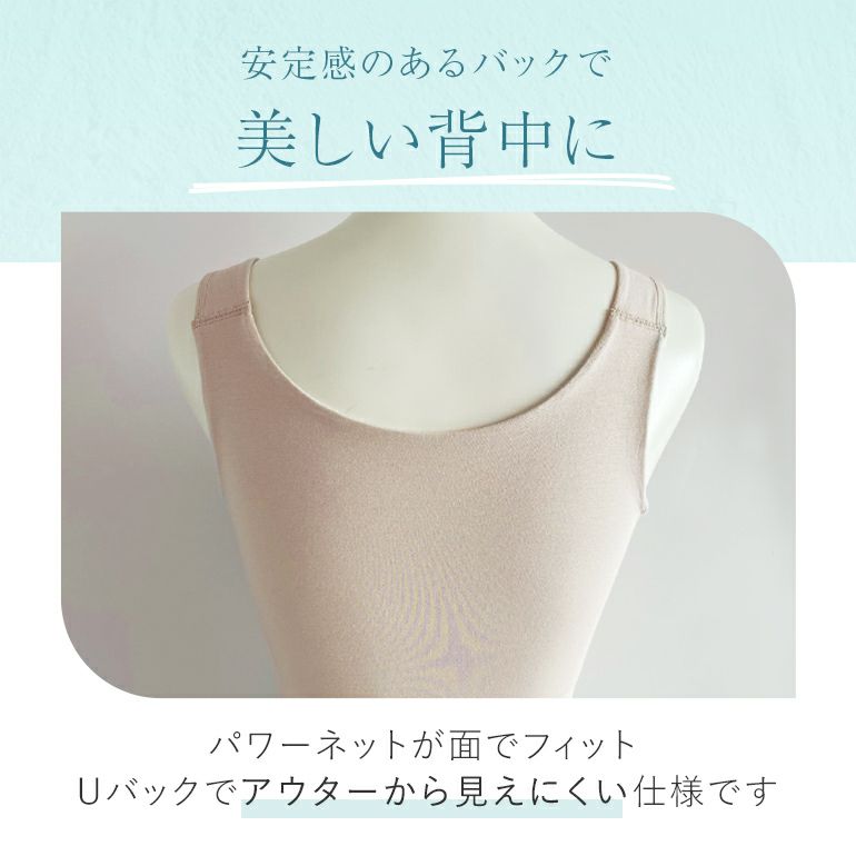 背中部分は、身生地にソフトパワーネットを挟み込んだ三重構造のUバック仕様。幅広パネルが背中の段差を押さえてフラットに整えつつ、バストの重みを支えます。