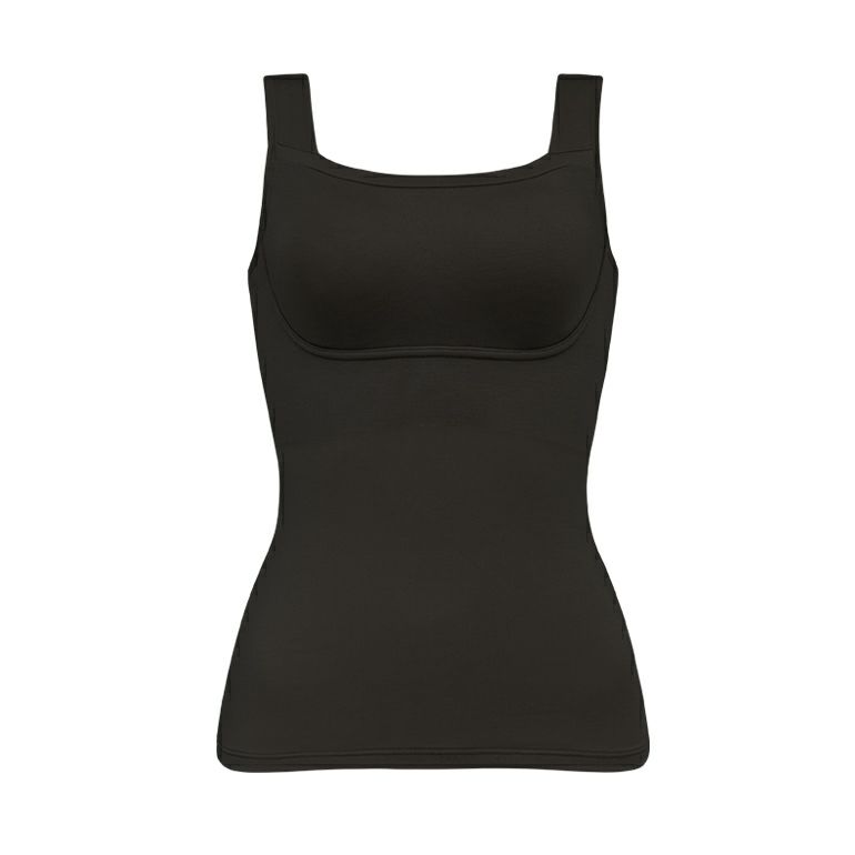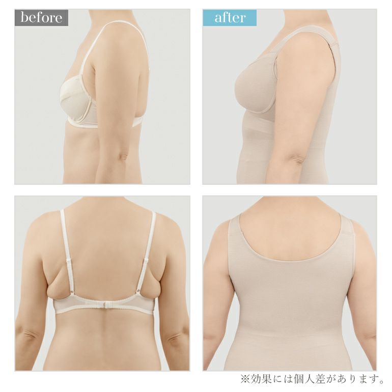 - 幅広のタンクトップ型ショルダーは、前側にパワーネットを挟み込むことでバストの引き上げをサポートします。背中側のショルダー部分は、パワーネットを内蔵せず生地の伸度をキープしているため、食い込みにくく優しい肌触りです。