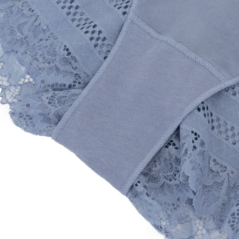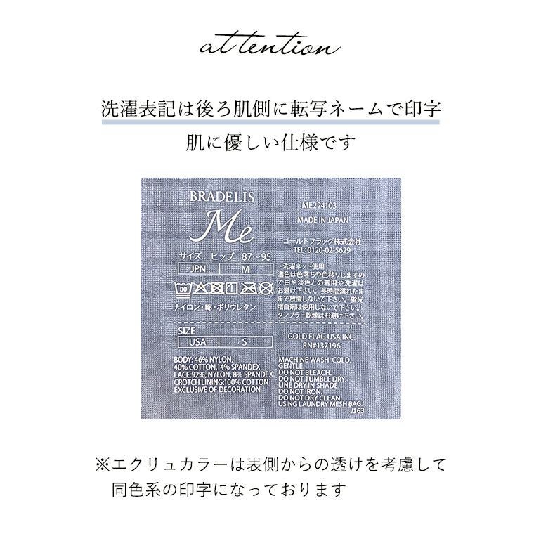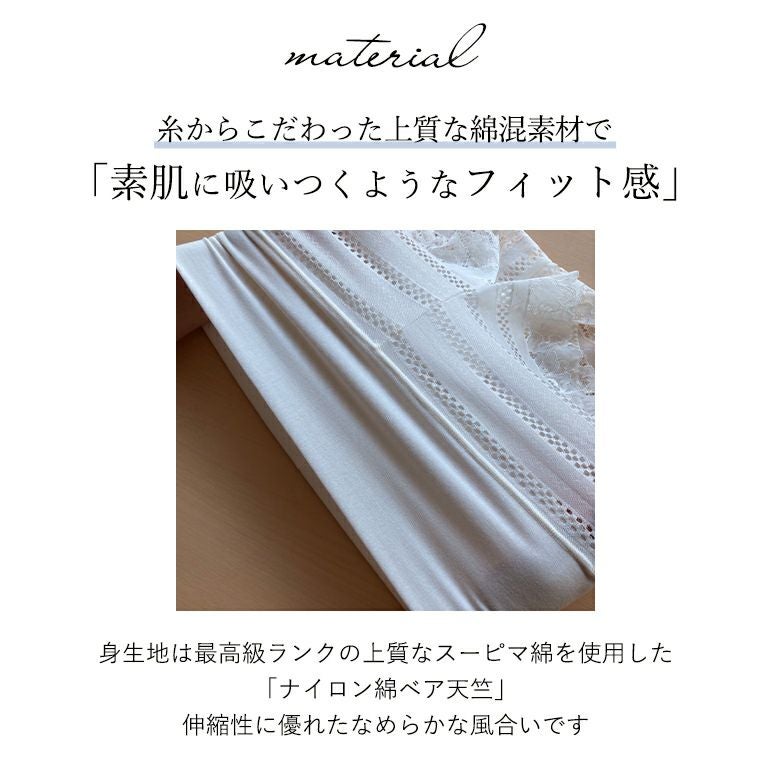 フロントとヒップ部分の透けて欲しくない部分にはナイロン綿ベア天竺*の裏打ちを付け、それ以外の部分はレースが透ける華やかで可愛いデザインです。