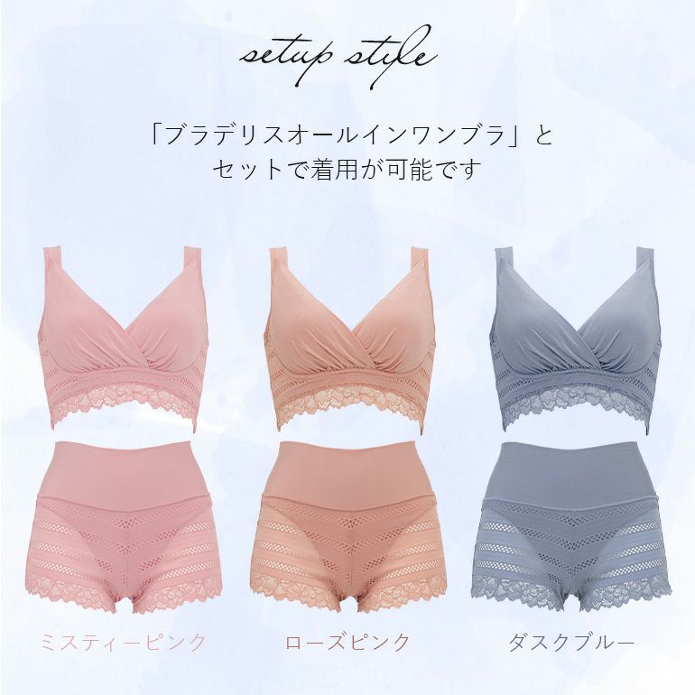 定番のブラデリスオールインワンブラ(ME122105)とセット着用でき、楽な着用感で日中や就寝時などのリラックスタイムにもマルチにお使いいただけるショーツです。
