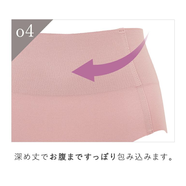 360度方向によく伸びる素材を使用し、まるで着ていることを忘れるようなフィット感が魅力の深ばきタイプのショーツです。はきこみが深めでお腹とヒップをすっぽり包み込む、ずれ上りにくいオリジナルパターンを採用しています。
