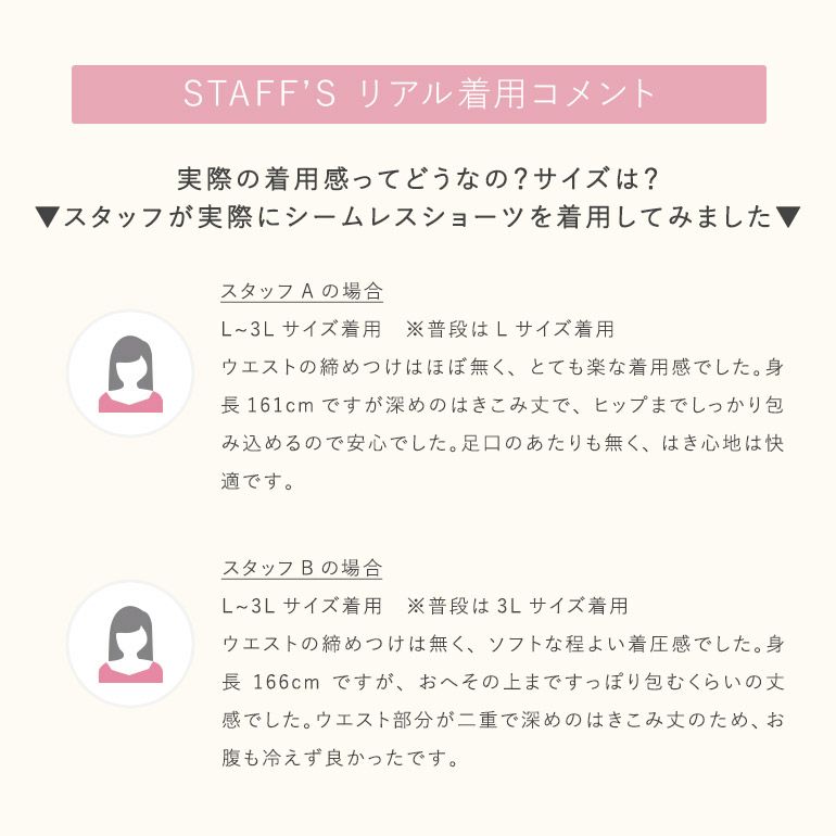 - テープやゴムを使用していないためそけい部の締めつけ感が無く、むくみやすい時期にもストレスフリーに着用していただけます。