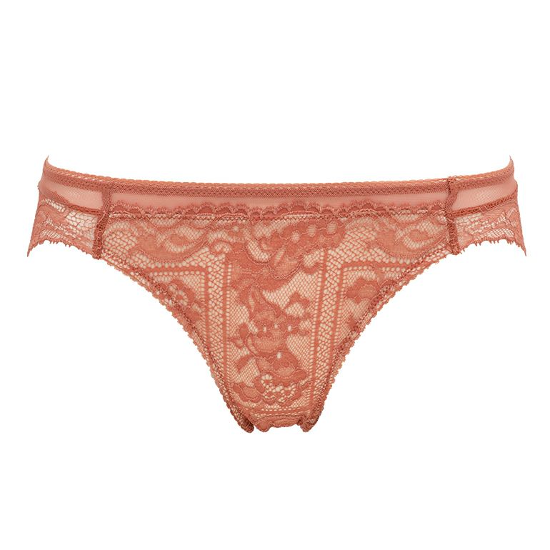 オールドレース調の柄がクラシカルな雰囲気の、リバーレース*を使用したパンティです。薄手パワーネットとレースを組み合わせた透け感のあるデザインです。