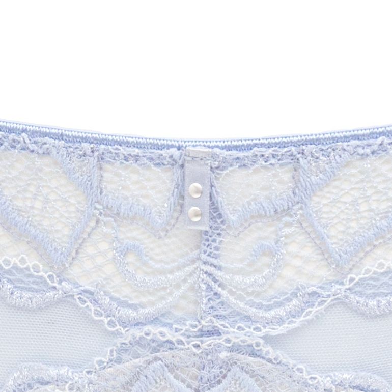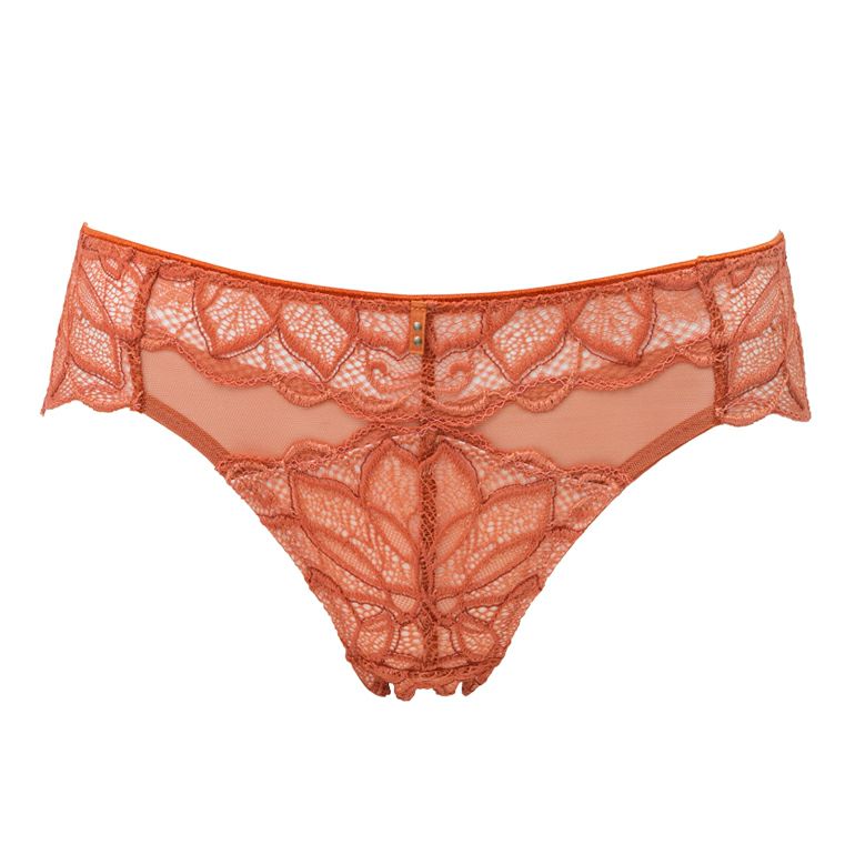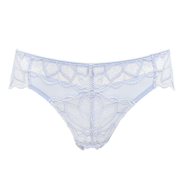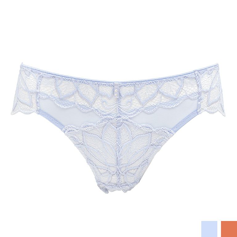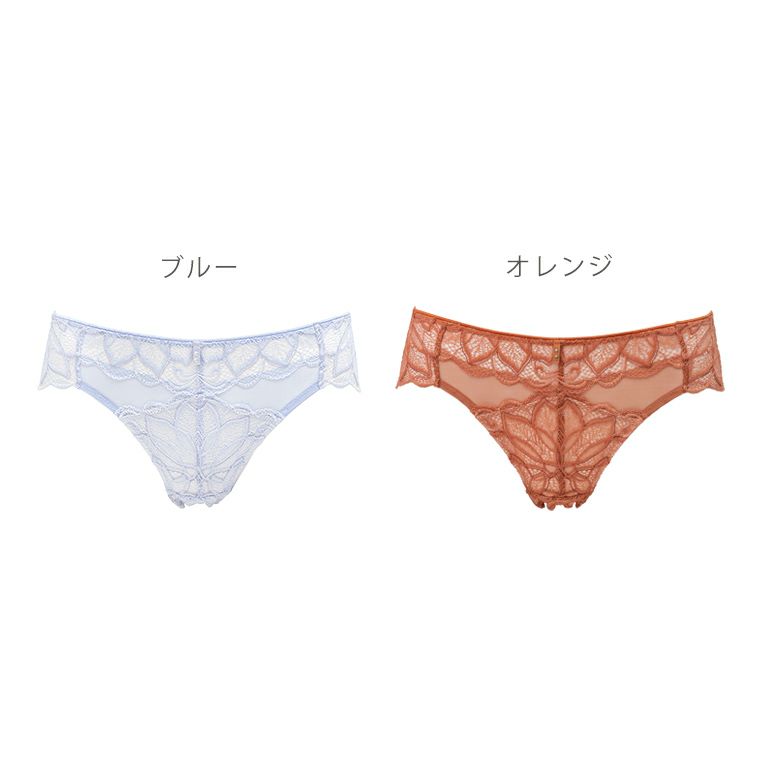 軽やかで大きな葉柄の3浴染め*ストレッチラッセルレース*を使用した、パンティです。フロントには各色に合わせたメタルモチーフ付きで、レース柄を活かした切替デザインがポイントです。