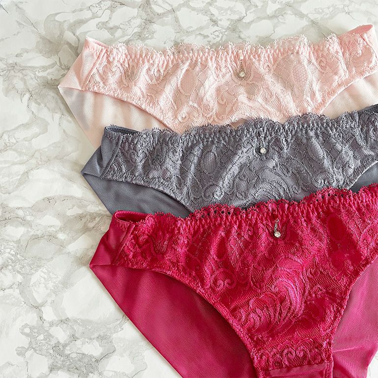 - 裏打ちは、ブラと同色のトリコット*を使用。滑らかな肌触りで、はき心地が良いです。