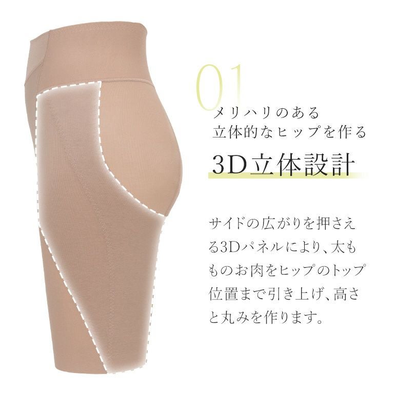 サイドの広がりを抑える3Dパネルにより、太もものお肉をヒップまで引き上げます。