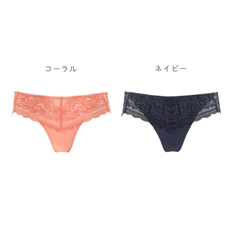 ボタニカル柄とスカラ部分の直線とアーチを組み合わせた模様が特徴のストレッチラッセルレース*を使用したパンティです。透け感のあるネット目にコード糸でメリハリを利かせた、立体感のあるデザインです。