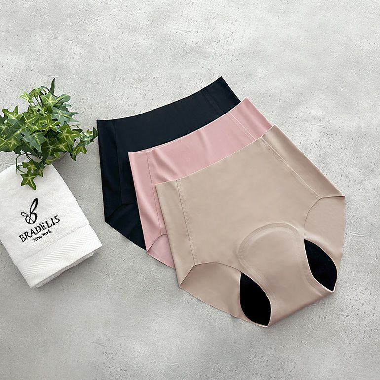 なめらかでとろりとした肌触りのストレッチナイロントリコット素材を使用した、シームレスタイプの吸水ショーツです。縫製・テープ不使用で肌触りが良く、ボトムスにも響きにくいのが特徴です。