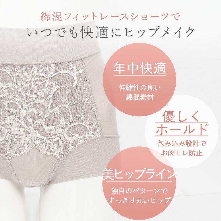 レースとサポート力のあるパワーネット、肌側のナイロン綿ベア天竺の三重構造。おへそから下腹周りに配置し、効果的にお腹を押さえてすっきり整えます。