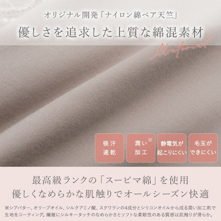 柔らかく滑らかで優しい着心地で伸縮性に優れたナイロン混のスーピマ綿素材。吸汗・速乾性があり、毛玉・静電気が起こりにくく、接触冷感と潤い加工で快適。