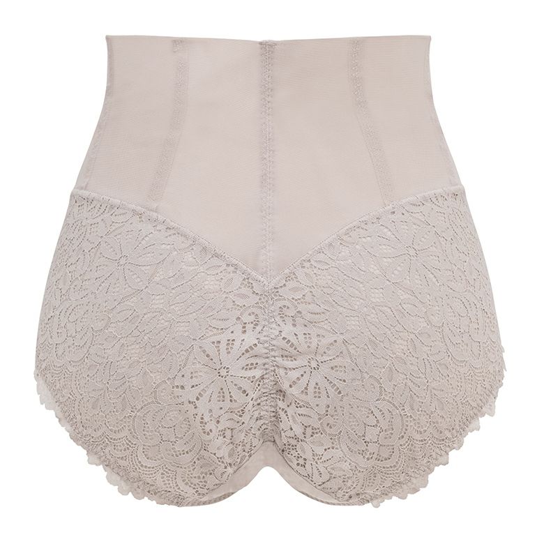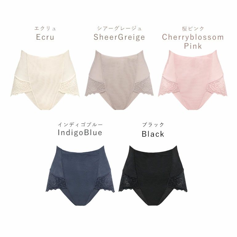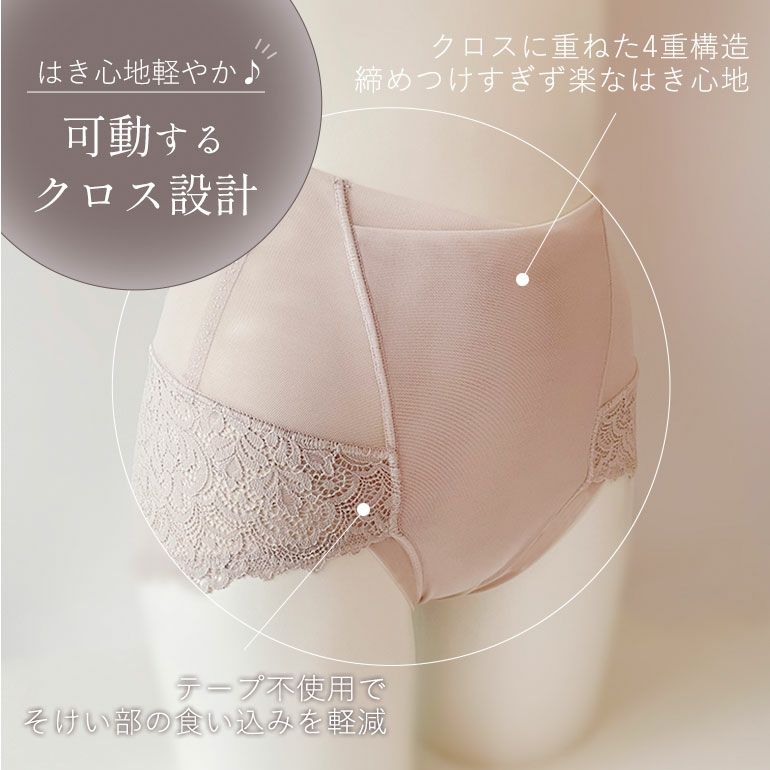 フロント部分はパワーネット四重構造で、お腹をなめらかにシェイプ。クロスに重ねたカシュクール仕様が動きに合わせて可動するため、楽なはき心地です。また、ハイウエスト設計で腰を支え、美しい姿勢をサポートします。