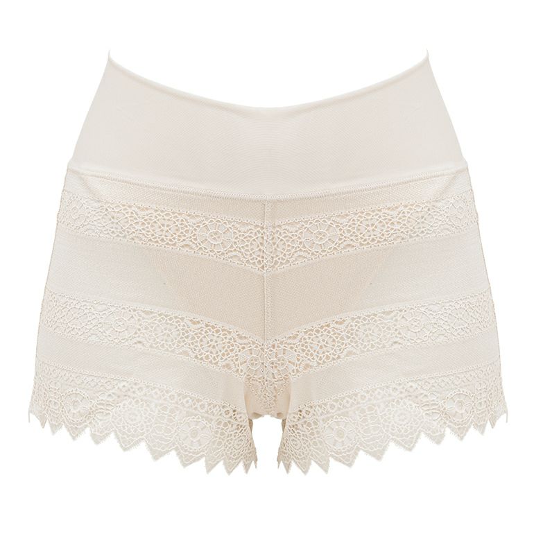 マット糸の幾何学柄と無地部分が交互に組み合わさったボーダー柄のストレッチラッセルレース*を使用した、一分丈ショーツです。ヒップ全体をレースですっぽり包み込み、お尻に食い込みにくいデザインです。