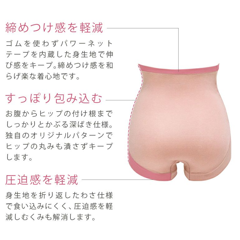 ゴムやテープを使用せずにフラットな縫製にしているため、お肌が敏感になる時期や体型が変化しやすい時期にも、締めつけることなく優しいはき心地がかないます。またヒップまでしっかりと包み込むため安定感がよく、ヒップの丸みを潰さないオリジナルパターンで心地よくフィットし、ヒップラインを綺麗に整えます。