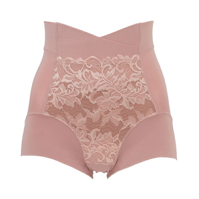 フロントは、伸縮性のある身生地とレースとパワーネットの三重構造により、お腹をすっきりと整えます。バックは身生地の一枚仕様のため、ヒップの丸みを潰さずに心地よくフィットします。
