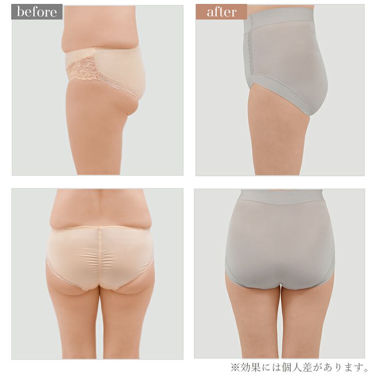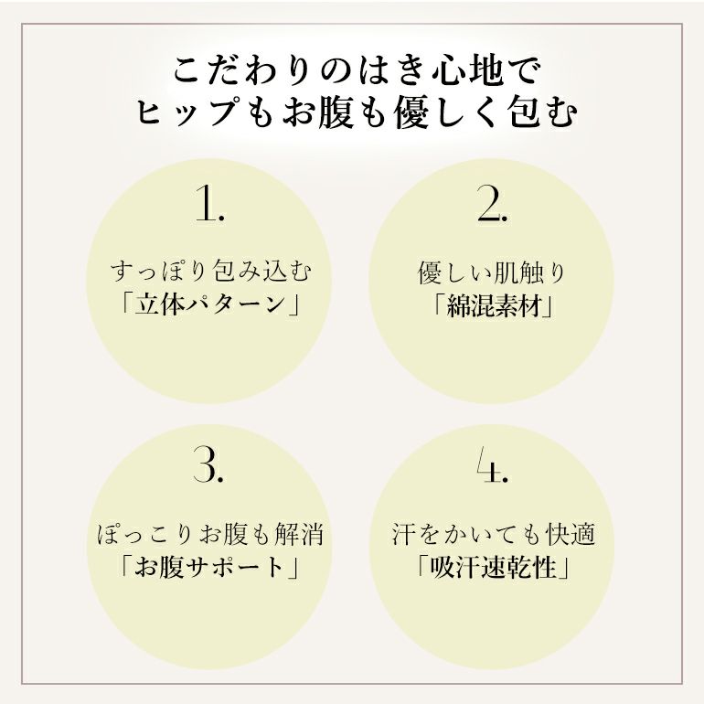 ウエストからヒップまですっぽりと包み込む深めのはきこみ丈で、ヒップの丸みを包み込みます。