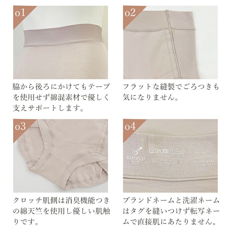 お腹部分は三重構造(表生地・パワーネット・綿ベア天竺*)で、面で押さえて気になるお腹をすっきりカバーします。また、ウエスト全体はテープ不使用のため、食い込みにくく楽なはき心地です。