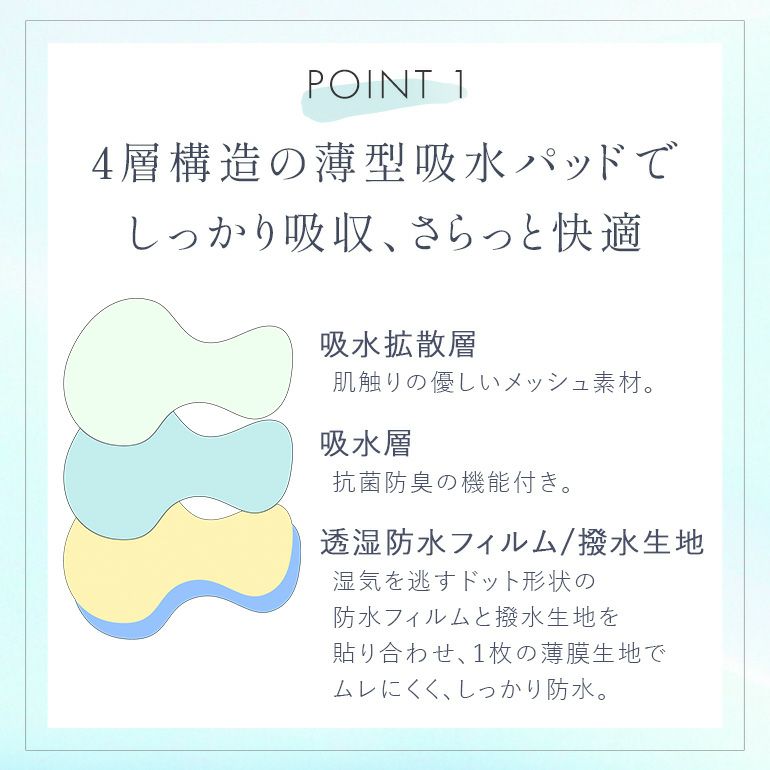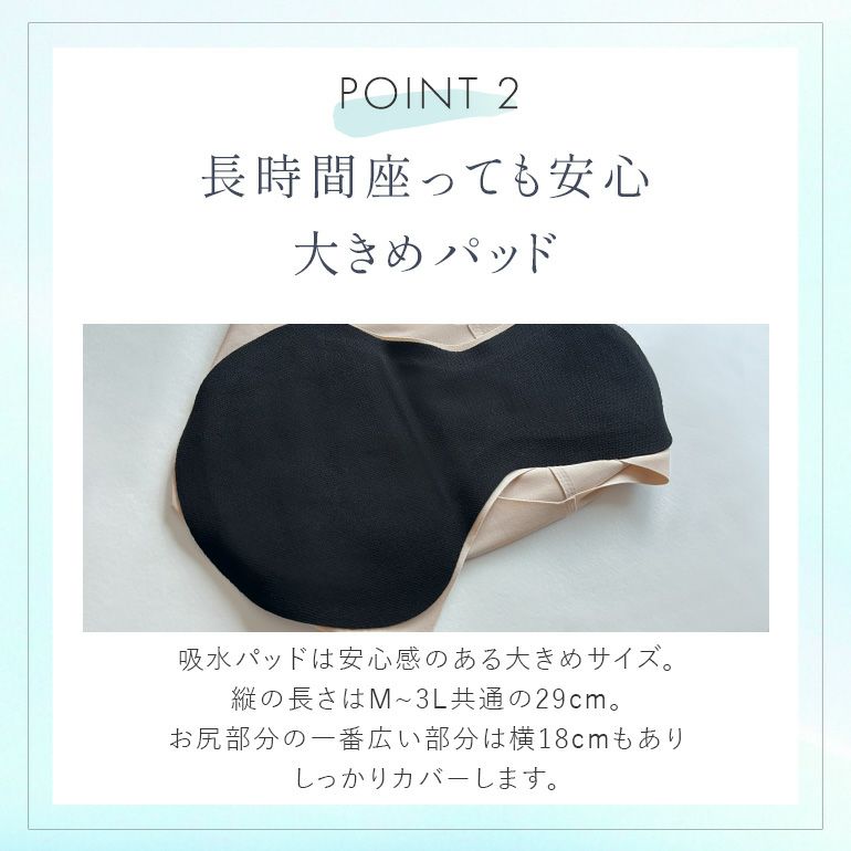 吸水パッドは長時間座るシーンでも安心感のある大きめサイズ。約2.0mmの薄型ながらしっかり吸水する四層構造のパッドで、軽い尿漏れが気になる日も安心です。