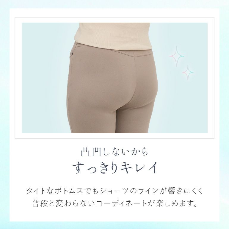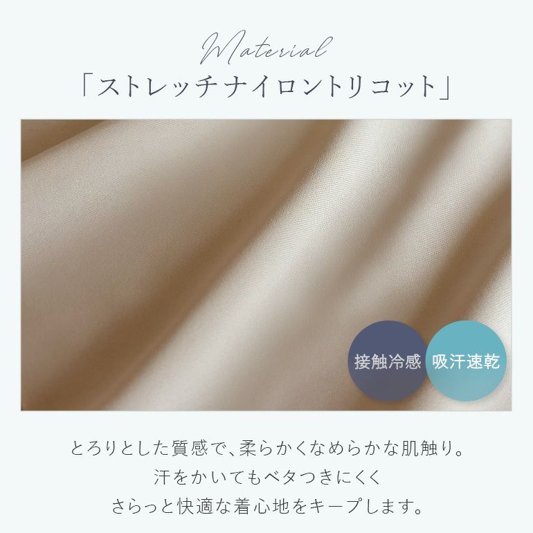 縫い目のないシームレス仕様で肌触りが良く、ボトムスから響きにくい設計。ウエストと足口は縫製とテープを使用せず身生地一枚の軽い着用感で、締めつけ感が苦手な方にもおすすめです。 身生地のストレッチナイロントリコット*は接触冷感・吸水速乾機能付きで、汗をかいてもベタつきにくくサラッとした快適な着心地をキープします。