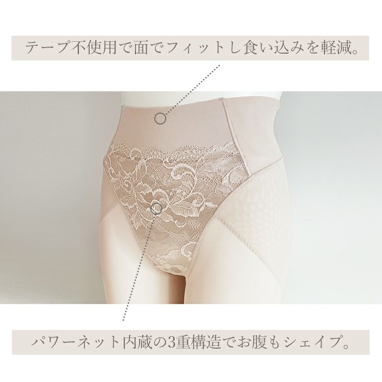 - ナイロン綿ベア天竺*・レース・パワーネットの3重構造。ウエスト上辺までサポートし、お腹をすっきりシェイプします。