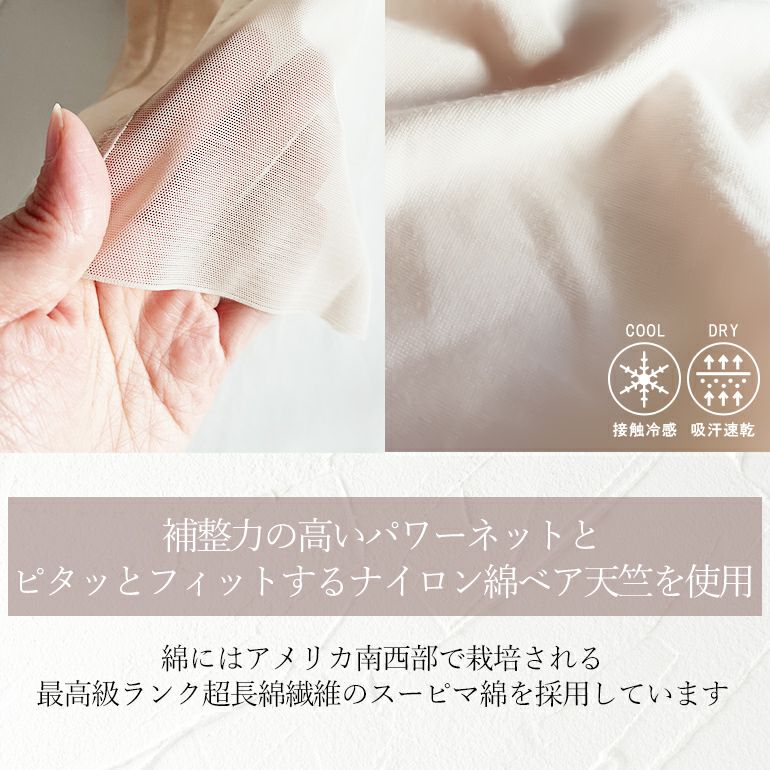 ウエストとフロント部分に美しい光沢感のある機能素材ナイロン綿ベア天竺*を使用。フロント部分は、伸縮性のあるナイロン綿ベア天竺*とレースとパワーネットの三重構造で、お腹をすっきり整えます。また、腰まわりに施したパワーネットパネルが、腰のはみ肉をしっかりとカバーします。