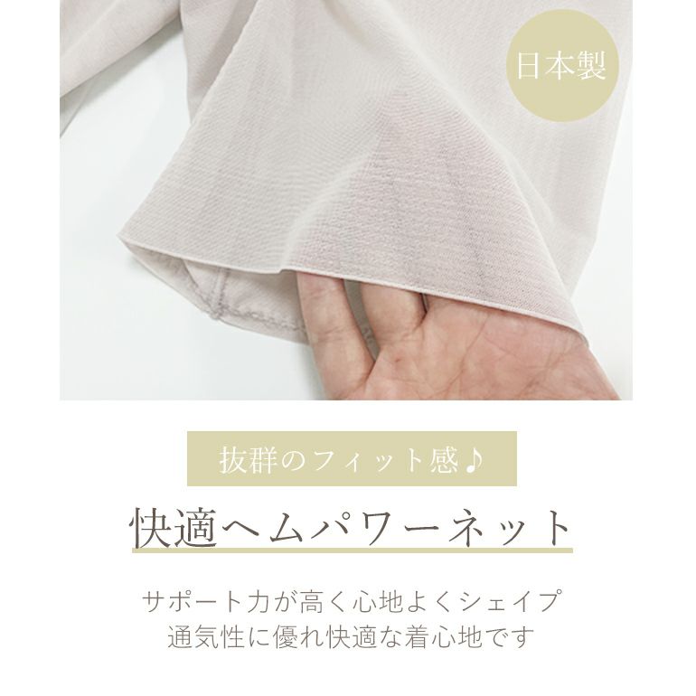 太もも部分には、通気性が良く動きにフィットするヘムパワーネット*を使用。適度な補整力で滑らかなレッグラインに整えます。