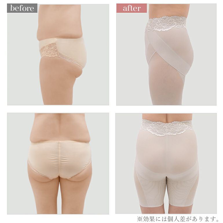 内ももからヒップ下のサイドに沿って施したパワーネットの裏打ち「引き上げパネル」が、太ももからお尻のラインに沿って持ち上げ、ウエスト方向へ引き上げて効果的にヒップアップします。