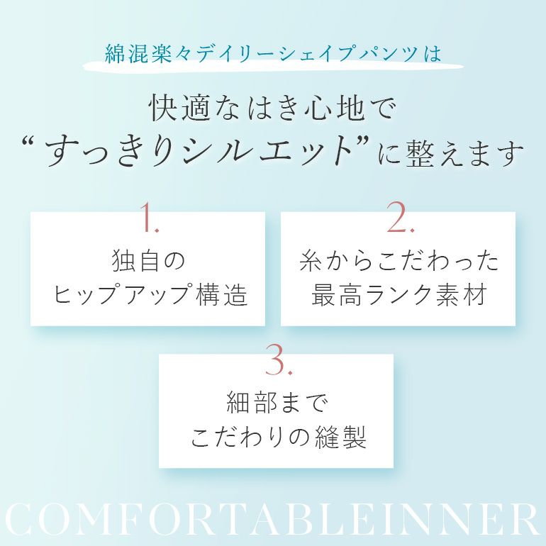 異なる素材を使用することで、楽なはき心地ながらヒップ周りをすっきり整え、ガードルが苦手な方にもおすすめのソフトな着心地です。