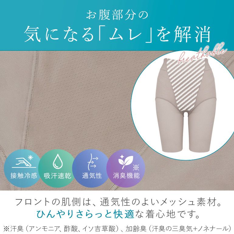 フロントは、身生地に通気性の良いメッシュ素材を裏打ちした二重構造で、気になるお腹をスッキリカバー。肌側は鉱石由来のひんやりパウダーを練り込んだナイロン糸のメッシュ素材を新採用し、ひんやり快適な着心地に。
