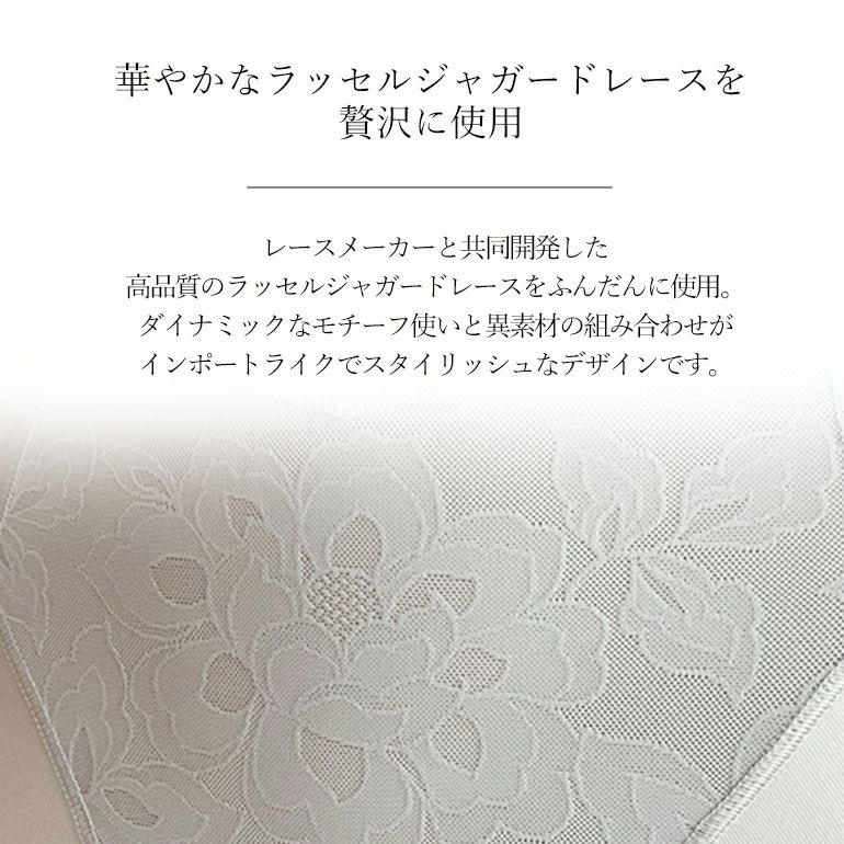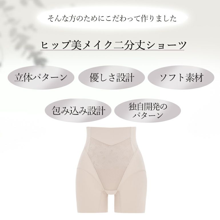 レースメーカーと共同開発した薔薇モチーフの高級レースを使用した、二分丈の深ばき補整ショーツです。長めのレッグ丈で下垂しがちなヒップを下からまとめてすくい上げて包み込みます。オリジナル設計の立体パターンでサポート力があるのに楽なはき心地です。