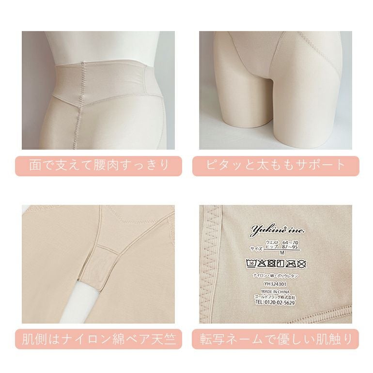※その他の特徴として、3種類の素材(ナイロン綿ベア天竺*、綿混トリコットサテン*、パワーネット)切り替えにより、心地よいシェイプ感に仕上げているため、苦しいガードルが苦手な方にもおすすめです。