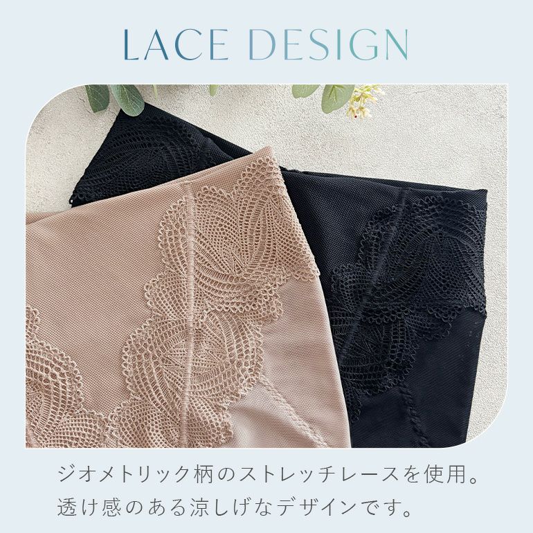 フロントはメッシュ生地の二重仕様で、下腹部にはV字にストレッチレースを重ね、程よい力でサポートします。