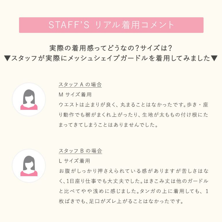 全体的に程よい締めつけ感で、締めつけが苦手な方、ガードル初心者さんにもおすすめです。