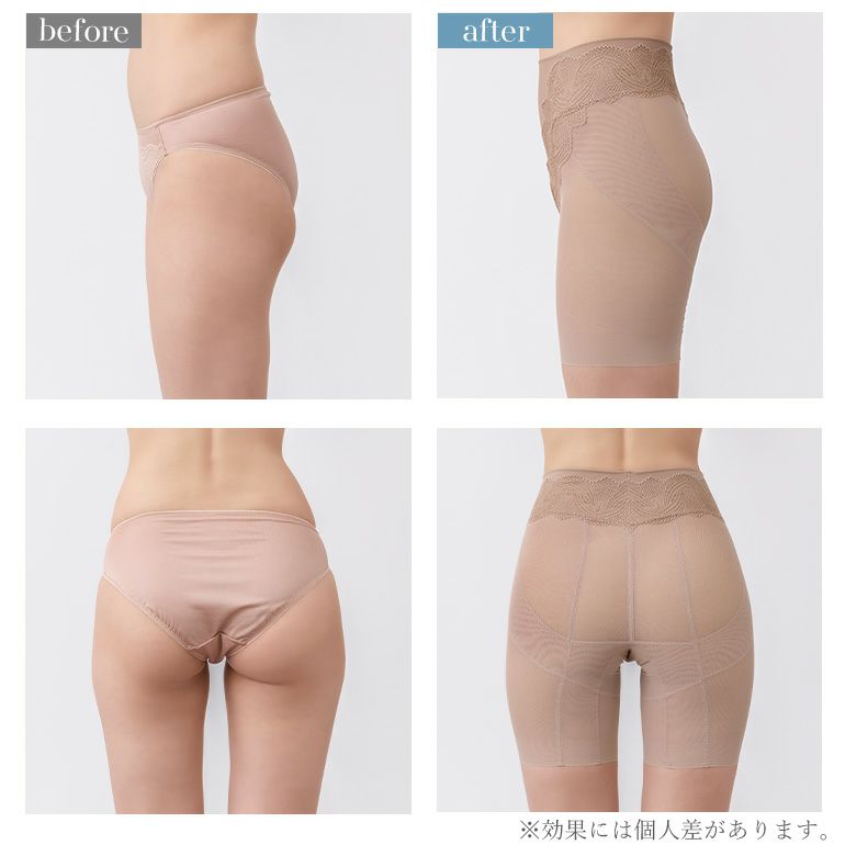 パワーの異なる2種類のパワーネットを使い分けることで、おしりと太ももの境目を作り、程よく太ももを引き締め、なめらかなヒップラインに整えます。