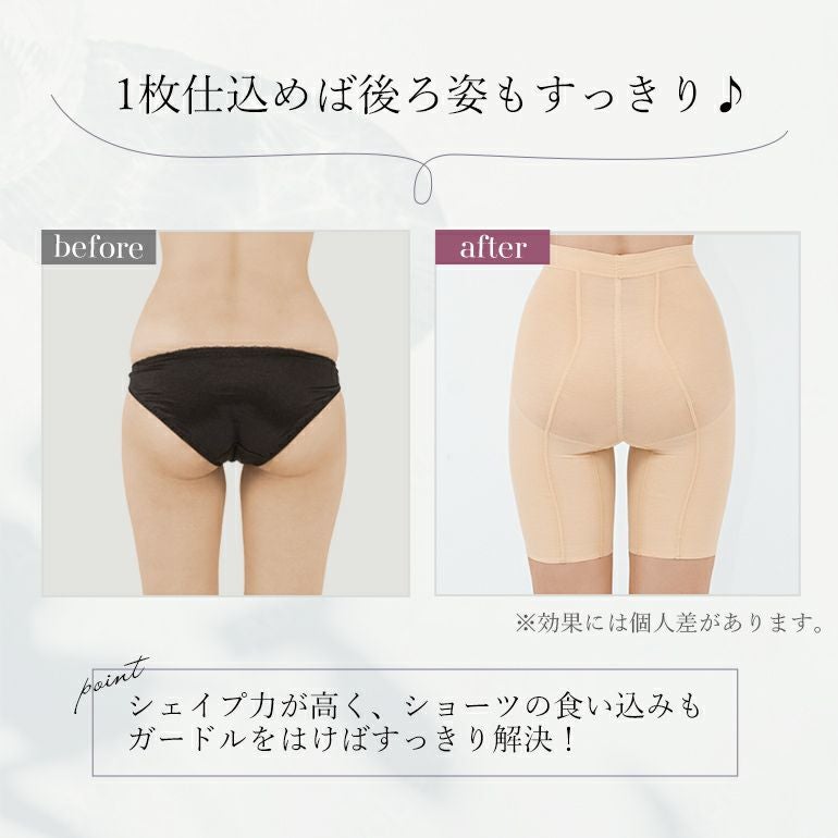 おしりの丸みを包み込み、メリハリのある立体的なヒップを作る補整ガードルです。サイドの広がりを抑える3Dパネルにより、太もものお肉をヒップまで引き上げます。