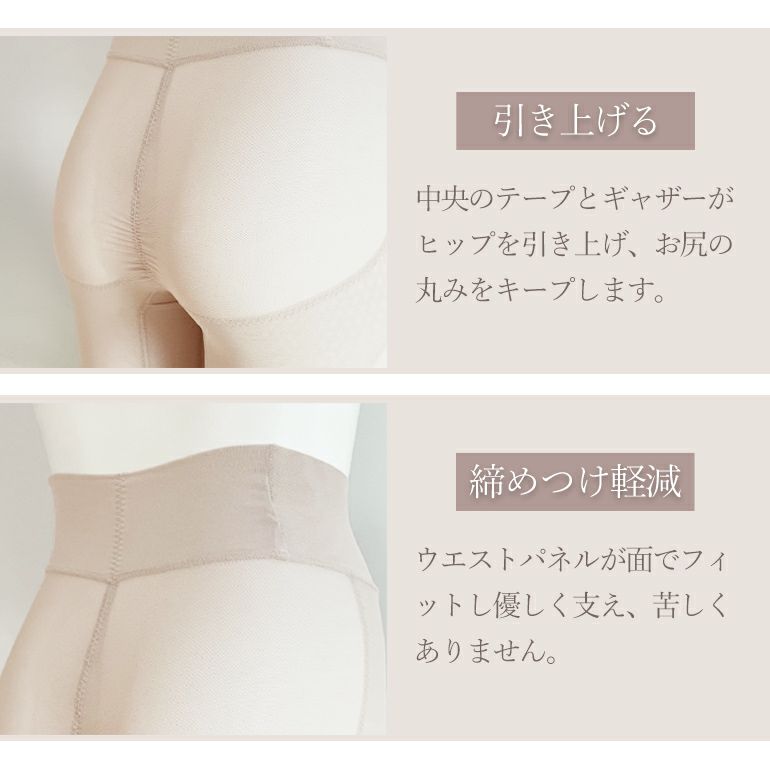 ヒップ中心に施したテープとギャザーがヒップを引き上げ、丸みのあるヒップラインを作ります。また、ヒップ下からウエストに向かって裏打ちした幅広のパワーネットが、ヒップを持ち上げ横広がりを軽減し、お尻と太ももとの境目を作ります。