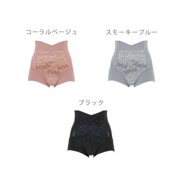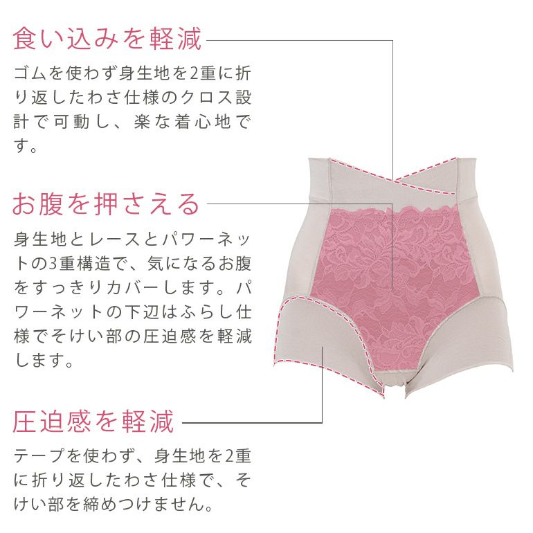 - レース下にパワーネットを内蔵した三重構造で、気になるお腹を優しくカバーします。