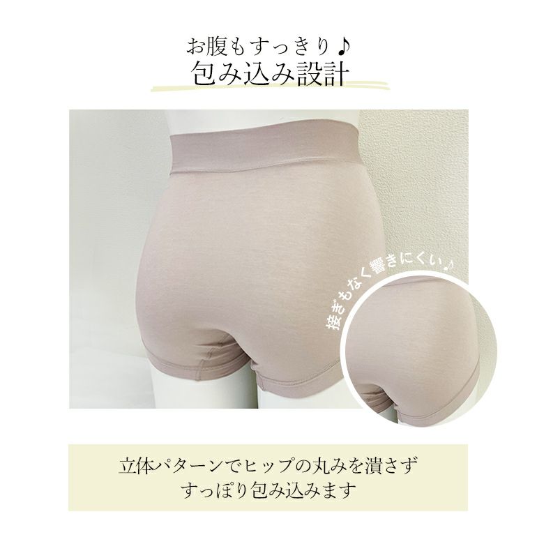 ウエストからヒップまですっぽりと包み込む深めのはきこみ丈で、ヒップの丸みを包み込みます。