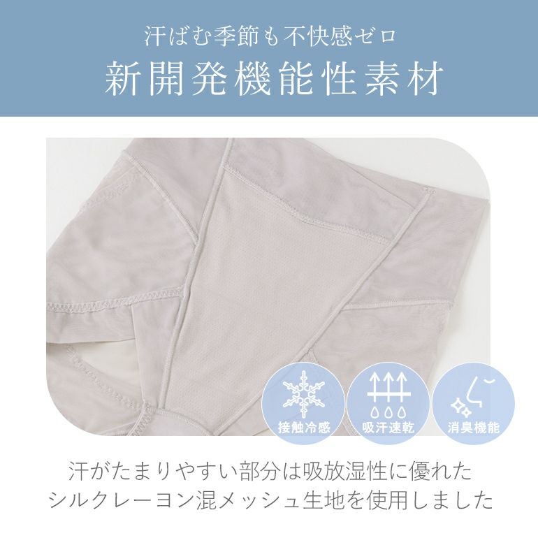 接触冷感・吸放湿性・消臭機能を備えた「シルクレーヨン混メッシュ素材*」と、ひんやり心地よいソフトタッチのパワーネットを組み合わせた、一枚でお腹やヒップラインを整えるゆきねえシリーズの補整ショーツ。