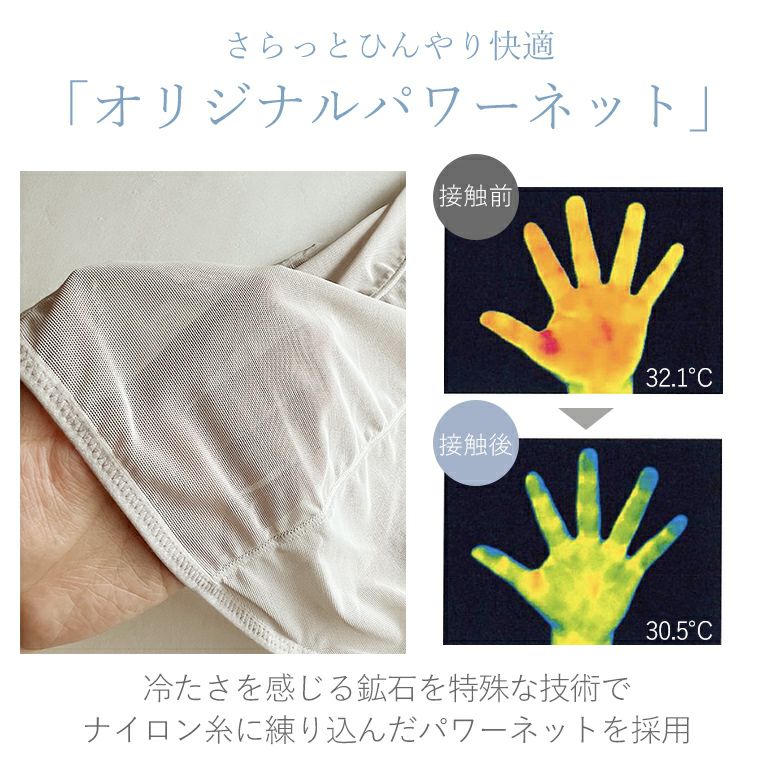 - 冷たさを感じる鉱石を特殊な技術でナイロン糸に練り込んだパワーネットを採用。通気性のあるメッシュ素材のため、速乾性もあり汗ばむ季節も快適。