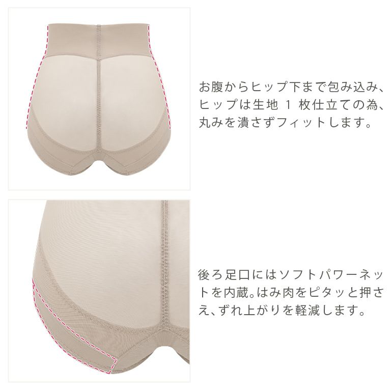 バック中心にはテープとギャザーを施し、綺麗な丸みのあるヒップラインをキープします。さらに、ヒップ下に施したパワーネットの裏打ち二重構造のパネルが、ヒップを下からしっかりと持ち上げます。足口はクロスパネル設計のため可動域が広く圧迫感を感じにくい仕様で、ヒップ部分に施した補整機能が太ももに流れたヒップのお肉を押さえて、ずれ上がりを軽減します。